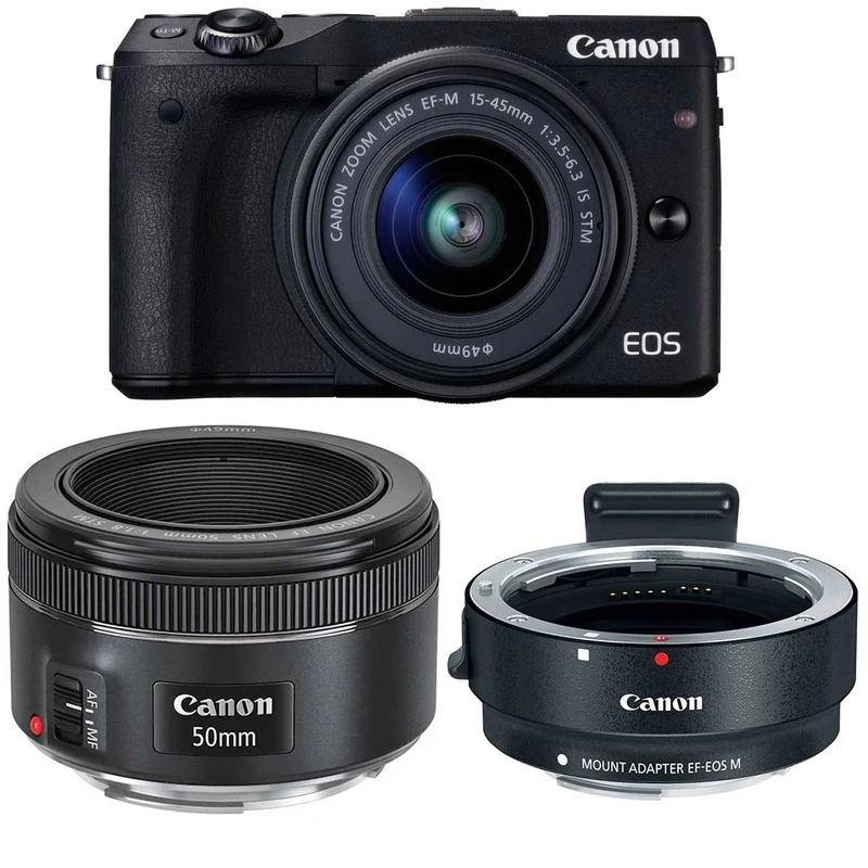 دوربین دیجیتال بدون آینه کانن مدل EOS M3 به همراه لنز 45-15 EF-M و EF 50mm f/1.8 STM میلی متر و آداپتور لنز کانن Mount Adapter EF-EOS M